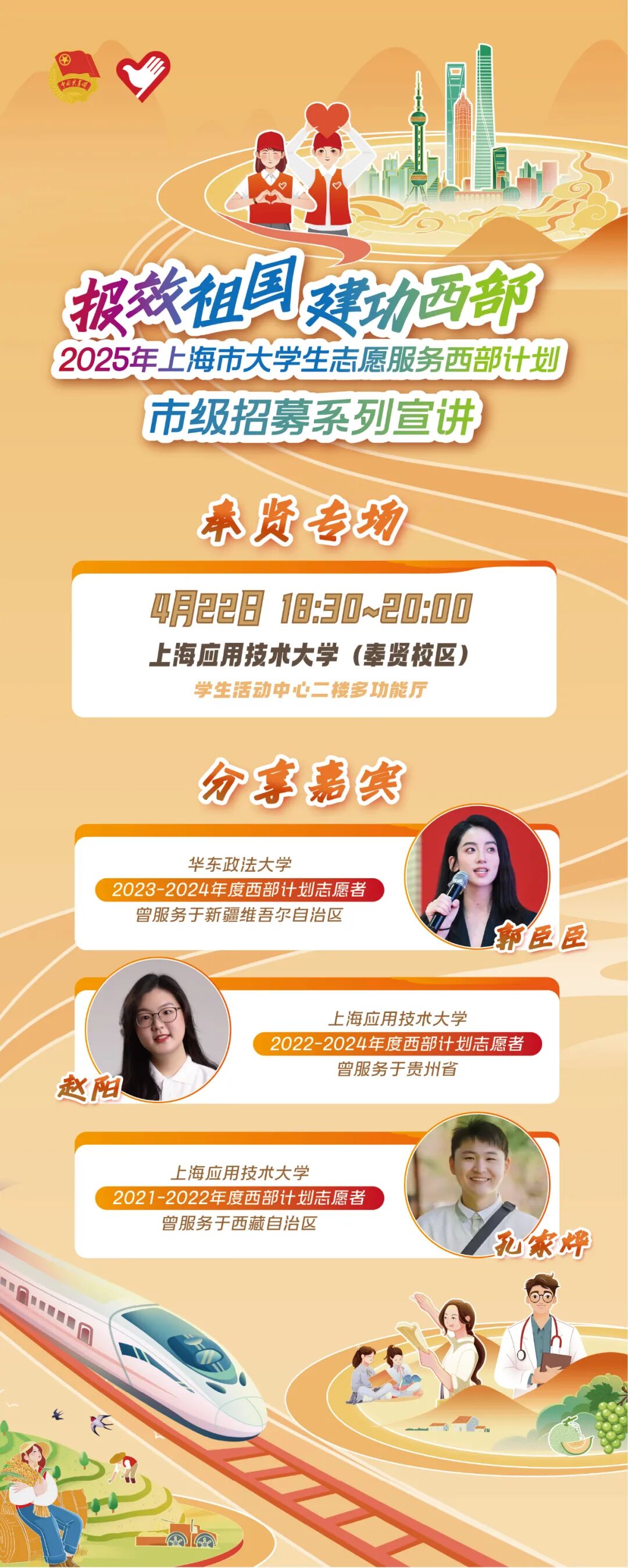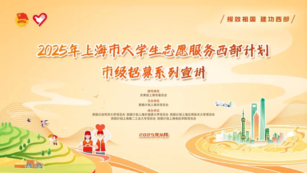 为了帮助同学们更好地了解西部计划,上海市项目办将于4月22日18:30在上海应用技术大学(奉贤校区)学生活动中心二楼多功能厅举办第一场西部计划市级招募系列宣讲。