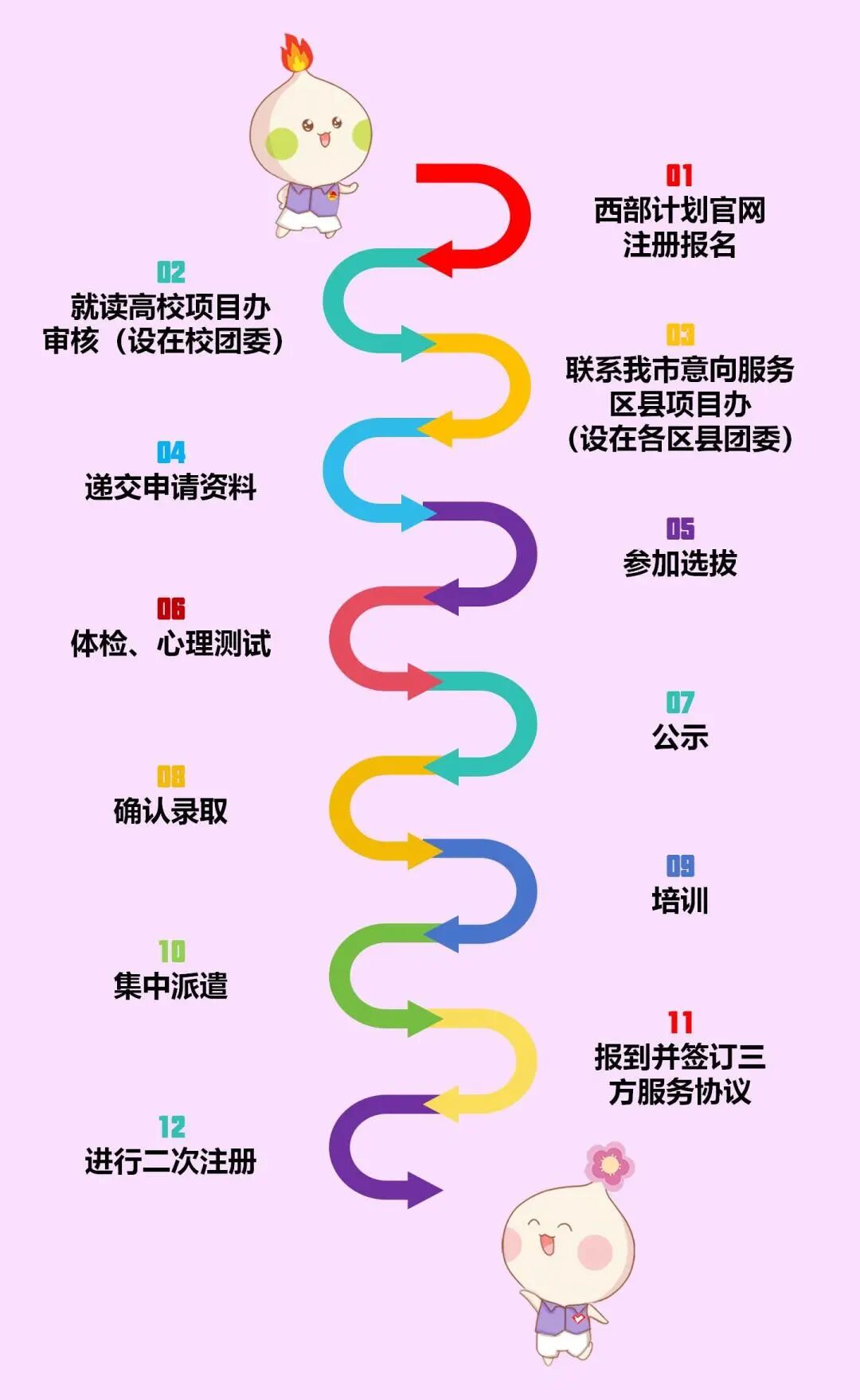 2. 由我市招募后派遣服务外省。西部计划官网(西部计划报名系统)注册报名→高校项目办(设在校团委)审核→参加就读高校选拔→体检、心理测试→公示→确认录取→系统岗位对接→集中派遣。(后续流程以服务地通知为准)