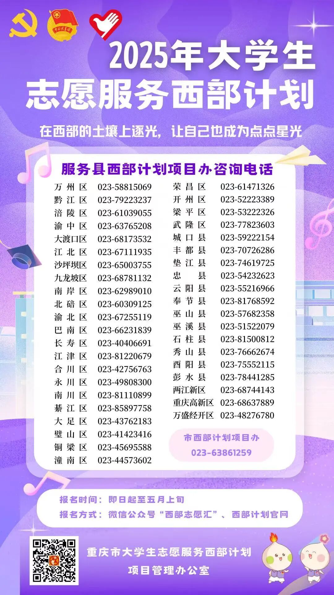 *了解我市各服务区县具体西部计划招募选拔、待遇保障等政策,请优先拨打区县项目办(设在各区县团委)咨询电话。